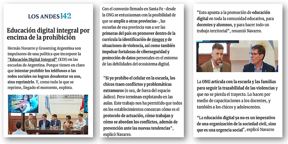 En una reciente entrevista con Los Andes Diario, nuestro Director Ejecutivo el Dr. Hernán Navarro afirmó “la prohibición del celular sin educación no protege: solo corre el problema afuera del aula. Por eso, cualquier regulación en el uso de celulares debe venir acompañada de Educación Digital Integral”.