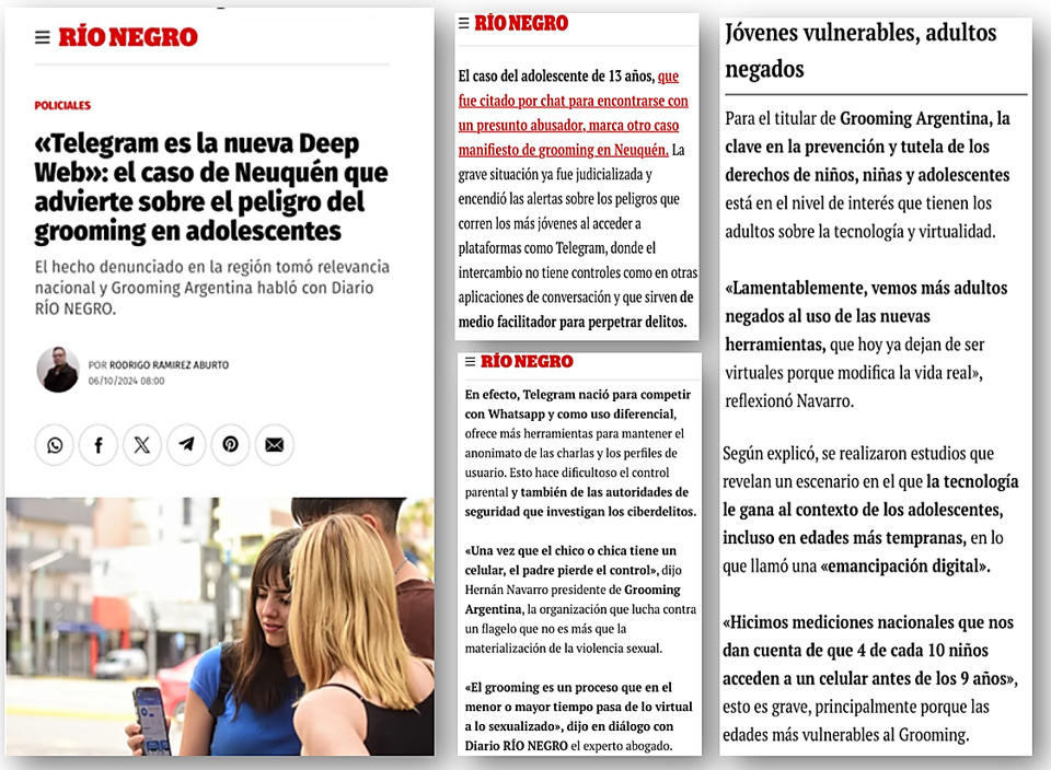 En diálogo con Diario Río Negro, el Director Ejecutivo de nuestra Institución, el Dr. Hernán Navarro, conversó sobre el reciente caso sucedido en Neuquén que alerta sobre el uso de Telegram, una plataforma utilizada por las redes de pedofilia.