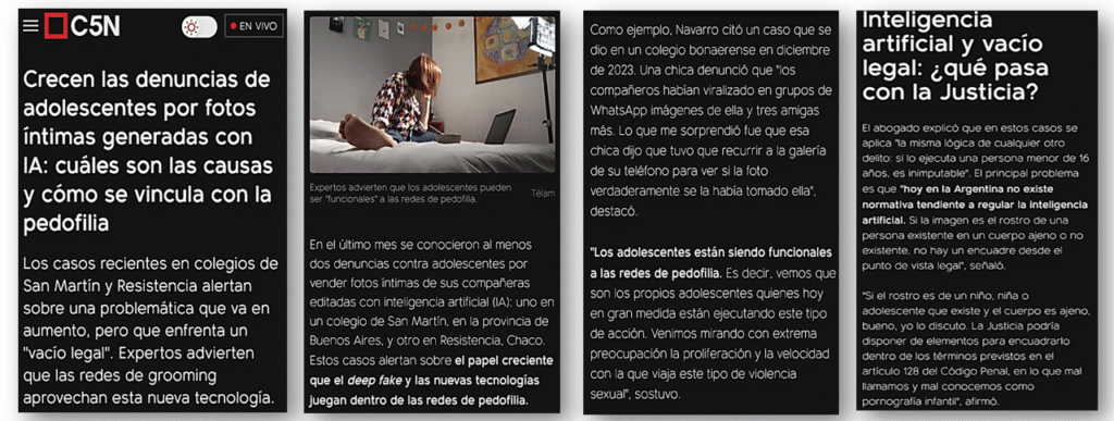 El Director Ejecutivo de nuestra Institución, Dr. Hernán Navarro conversó con C5N sobre el preocupante aumento de denuncias por fotos íntimas de adolescentes generadas con IA, una práctica que no solo vulnera los derechos de NNyA, sino que también está estrechamente vinculada a las redes de pedofilia.