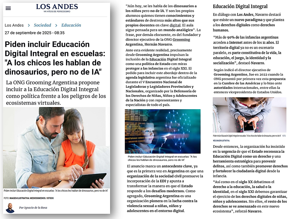 Dialogamos con Los Andes Diario sobre la importancia de incorporar la Educación Digital Integral en el sistema educativo. Las escuelas no pueden quedar atrás frente a un escenario donde niñas, niños y adolescentes crecen atravesados por Internet.